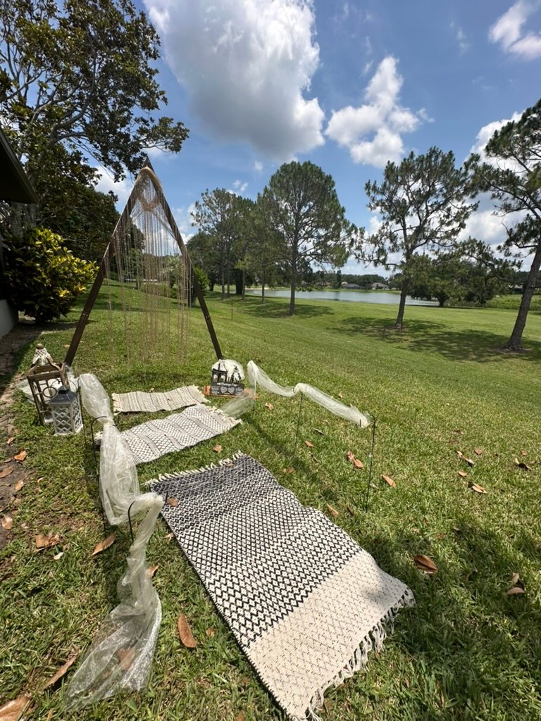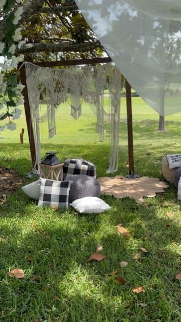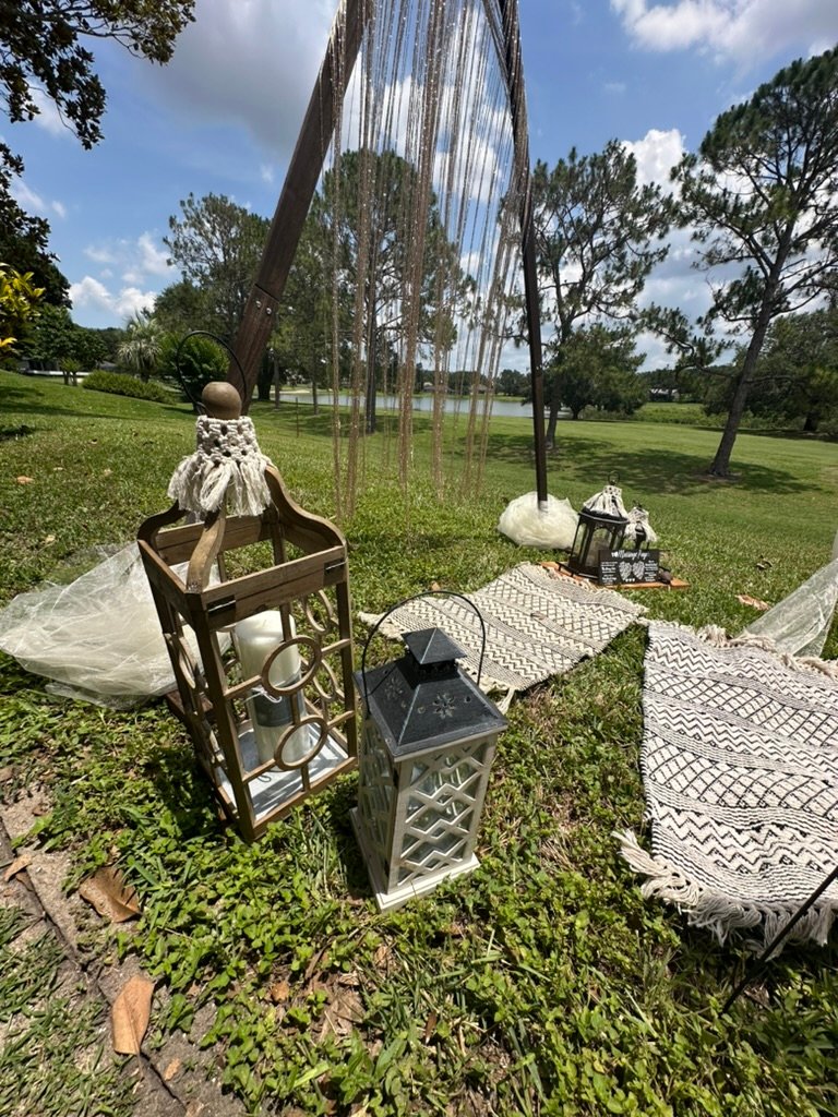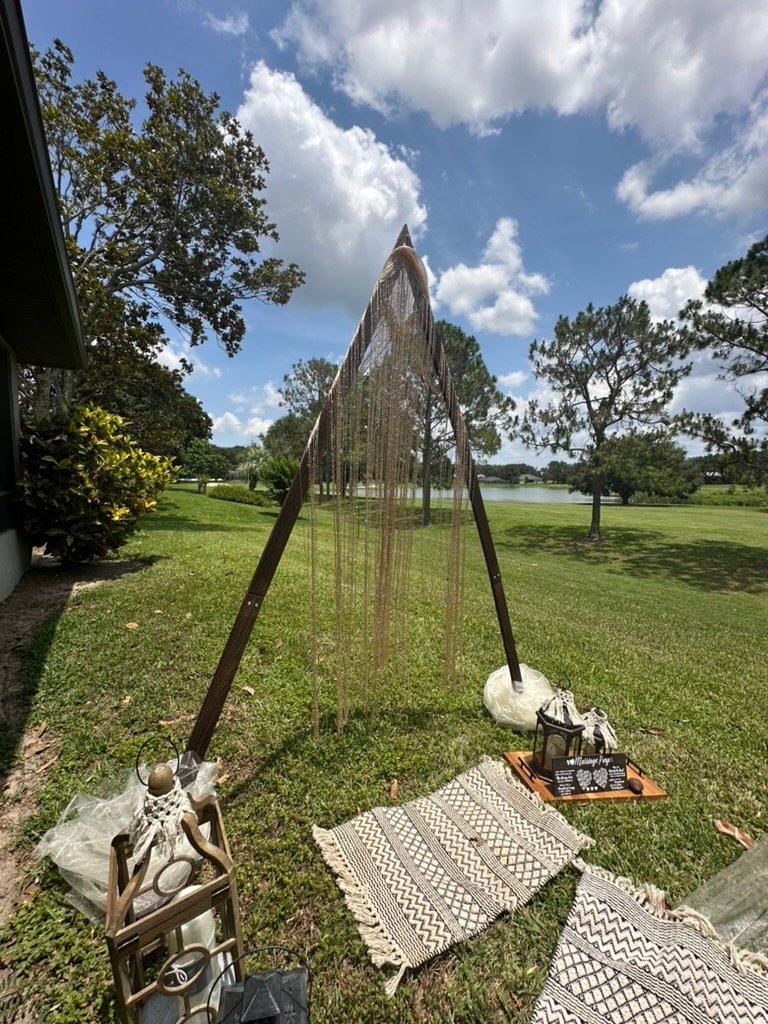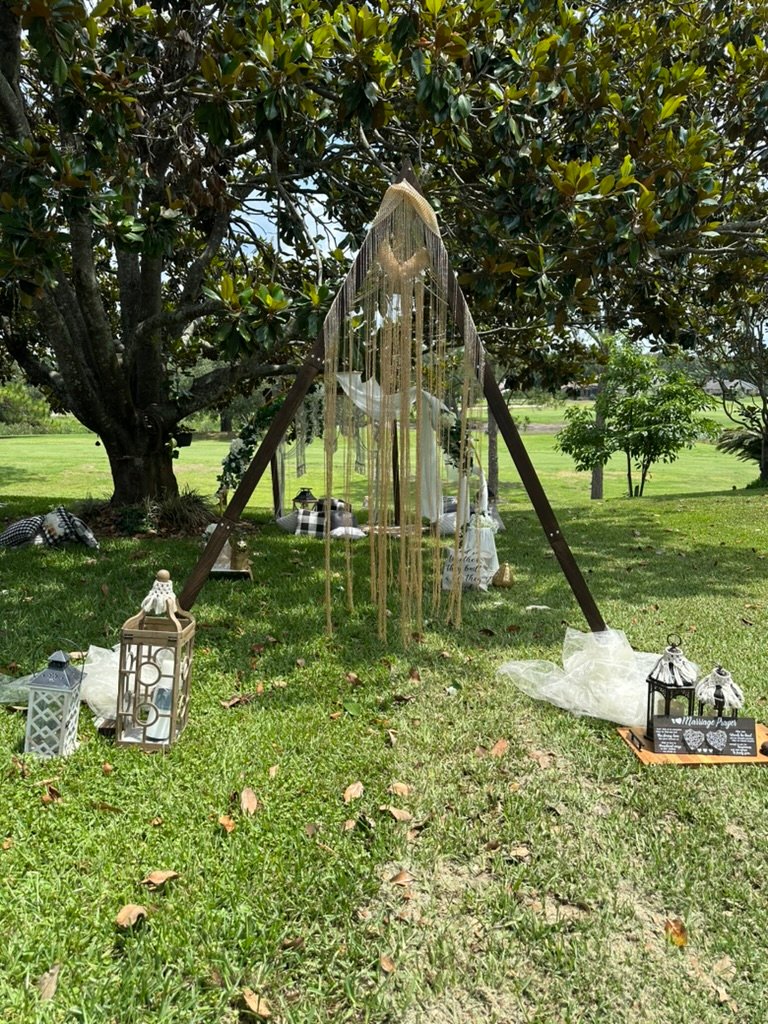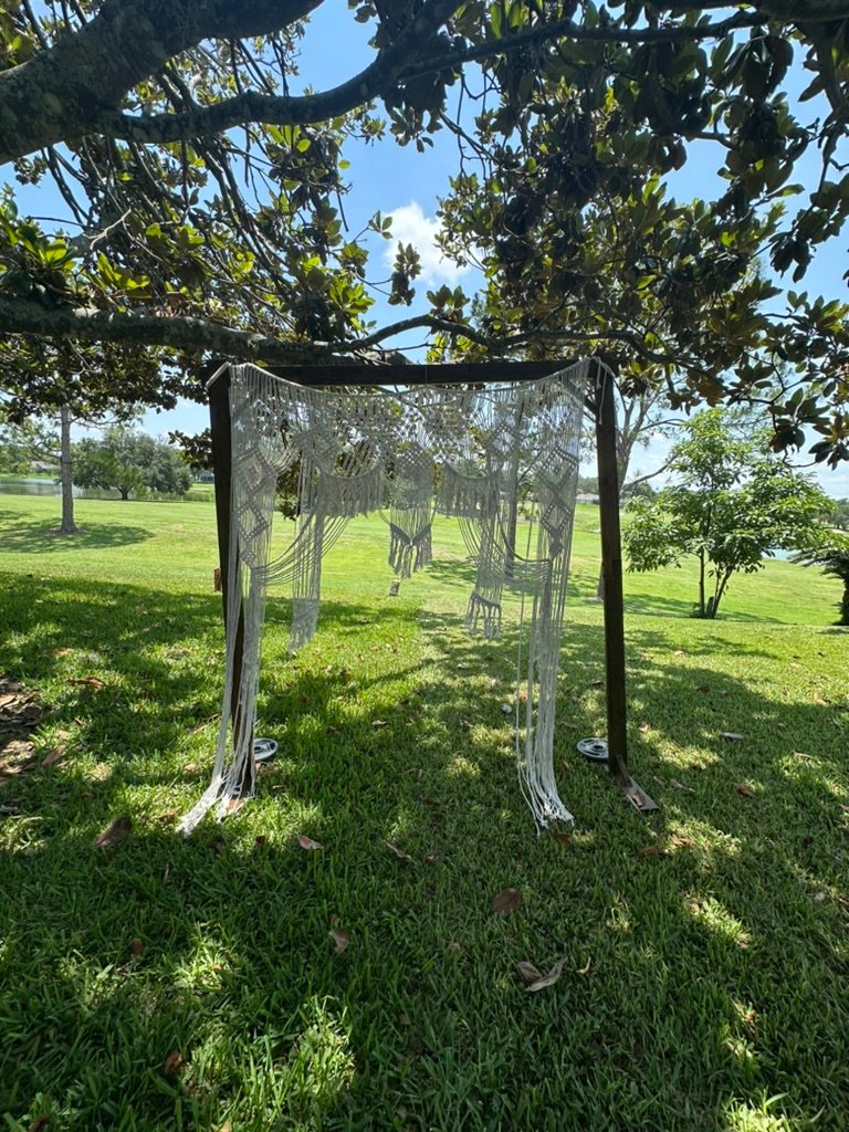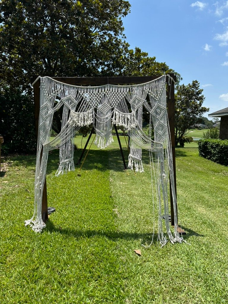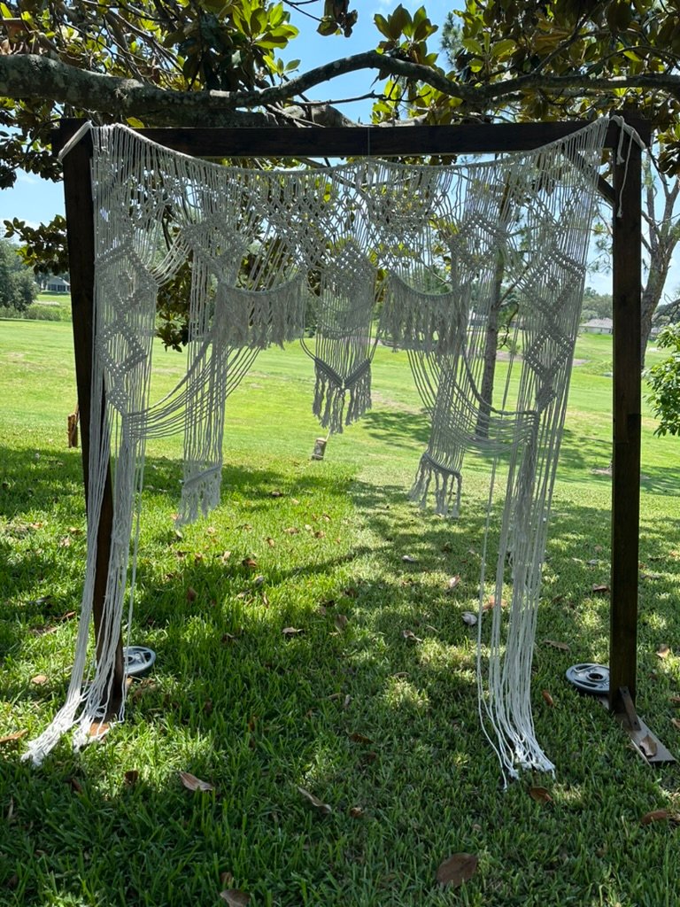 • Macrame Backdrop – Ideal for framing your ceremony space, sweetheart table, or photo booth. This handcrafted piece creates a captivating focal point for your vows and photos.